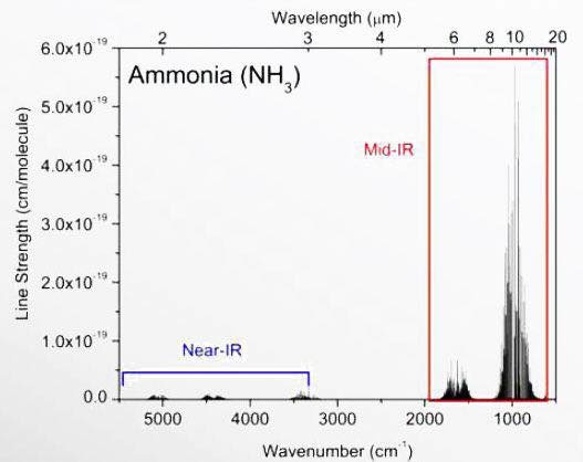 氨气分子近红外(蓝色)与中红外(红色)光谱强度对比