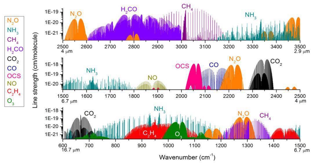 2.9 μm-16.7 μm中远红外波段的常见分子指纹光谱