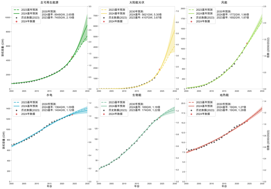 预测数据显示,截至2024年,七类关键碳中和技术的部署进度仅完成了2030年目标规模的1%-42%。若维持过去十年的平均发展速度,到2030年,仅电动汽车和清洁氢能两个领域有望达成目标。值得注意的是,基于2024年最新数据的预测表明,2030年全球可再生能源装机量有望达到基准年的2.65倍,较此前预测的2.19倍显著提升。2024年全球新增装机585GW,年增长率达15.1%,创历史新高,这为实现“三倍可再生能源”目标提供了有利条件。