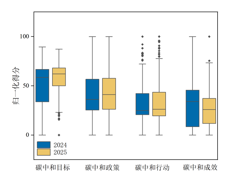 总体而言,2025年全球碳中和进展呈现出“目标与政策持续推进、行动进展持平、减排成效尚未充分显现”的复杂局面。根据量化评估标准(0分为无进展,100分为国际当前最佳实践),全球在目标与政策方面的中位数得分显著提高,行动维度中位数得分虽略有增长但提升有限。与此同时,成效维度的中位数得分出现下降,主要归因于部分国家碳排放强度下降幅度未达预期。需要指出的是,此次成效评估基于2023年数据,随着各国持续推进相关行动,预计减排成效将在未来数年中逐步显现。