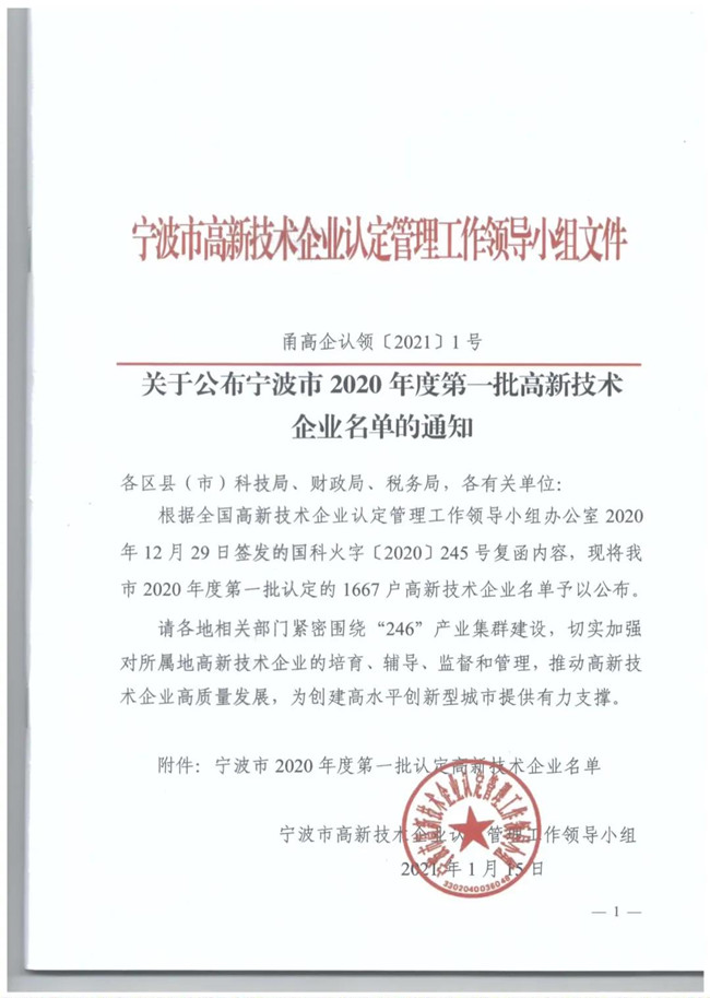 定管理工作指引》的相关规定,宁波市高新技术企业认定管理工作小领导小组公布浙江2020度第一批高新技术企业认定名单,凭借专业的研发队伍、雄厚的技术实力、持续的创新能 力、科学的企业管理,宁波海尔欣光电科技有限公司被顺利认定为国家高新技术企业。