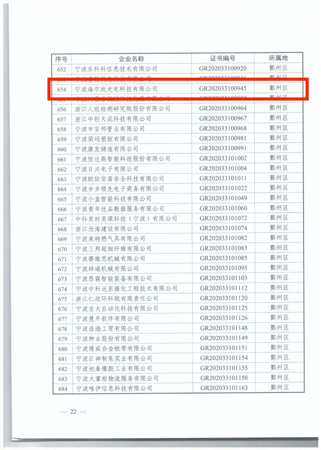 喜讯!热烈祝贺宁波海尔欣光电获得“高新技术企业证书”