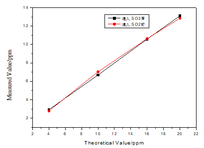 图6为该分析仪的抗SO2气体干扰性能测试结果,横轴为氨气浓度的理论值,纵轴为实测值,红色数据点为氨气单一气体的浓度实测值,黑色数据点混入SO2气体之后氨气浓度的实测值。测试中用两台质量流量计控制标准浓度氨气和氮气的混合比例来获得不同浓度的氨气。对应氨气浓度为4、10、16、20ppm,分别混入SO2浓度为60、68、80、96mg/m3。如图6所示,混入SO2气体前后对氨气浓度值的测量并没有影响。而且,可以看出实测数据值有很好的线性度。最后通过数据修正可获得准确的接近理论值的氨气浓度。