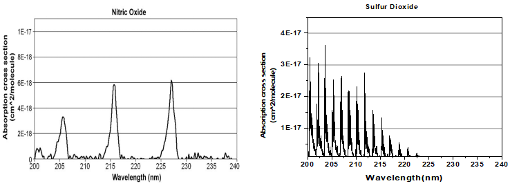 图5 NO的吸收光谱(左图),SO2的吸收光谱(右图)