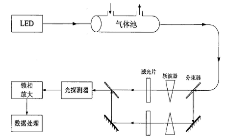 DOAS主要利用吸收分子在紫外到可见光波段的窄带吸收强度通过朗伯-比尔定律来推演气体的浓度,其特点在于根据被测气体在所选波段上的频率特性,将吸收截面分成两部分,随波长快速变化的窄带吸收截面和随波长缓慢变化的宽带吸收截面。将透射光强与原始光强对比,得到对比的吸收度,利用多项式拟合出一条吸收度慢变化曲线,然后将慢变化曲线从吸收度中减去,便可得到差分吸收度的信号,将差分吸收度与分子的吸收截面进行拟合,可计算得到待测气体的浓度值。如图4,氘灯发射宽光谱光源,经气体吸收后的光被分束器分成2束光路,斩波器对光路进行调制,滤光片使2束光路分别通过不同的波长,最后在锁相放大器中解调获得气体浓度。