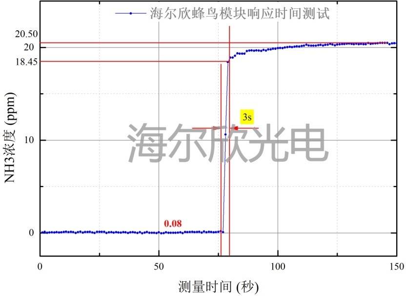 在通气流量为2L/min的条件下,测量得到蜂鸟??榈南煊κ奔?T90)为3秒,这不仅能够满足工业现场快速检测氨气浓度的要求,而且使得精准喷氨成为可能。