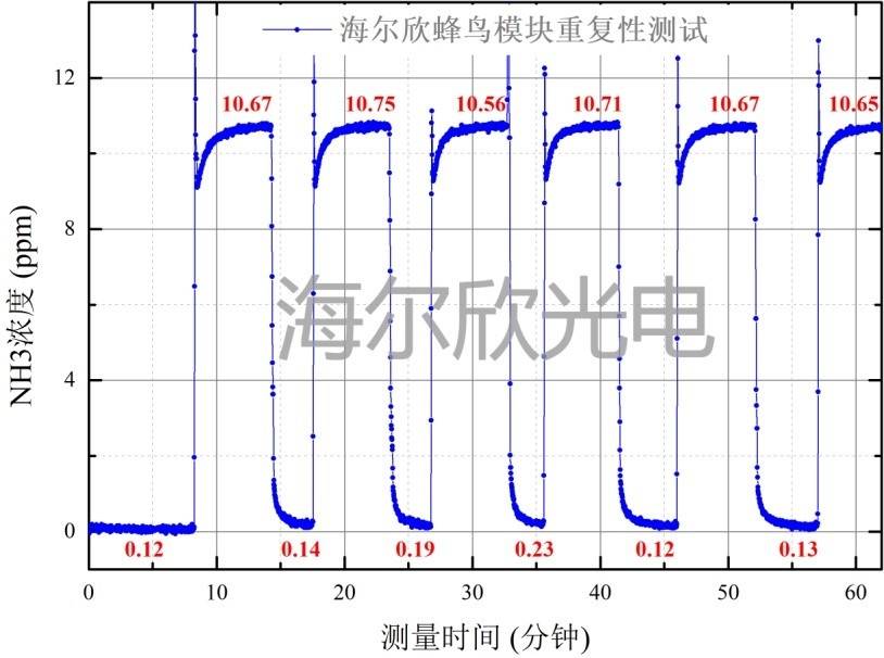 上图是依次通入氮气和10.4ppm氨气的浓度测量曲线,从图中可以看出在长达一小时的测量时间内,同一浓度测量的偏差小于0.2ppm。