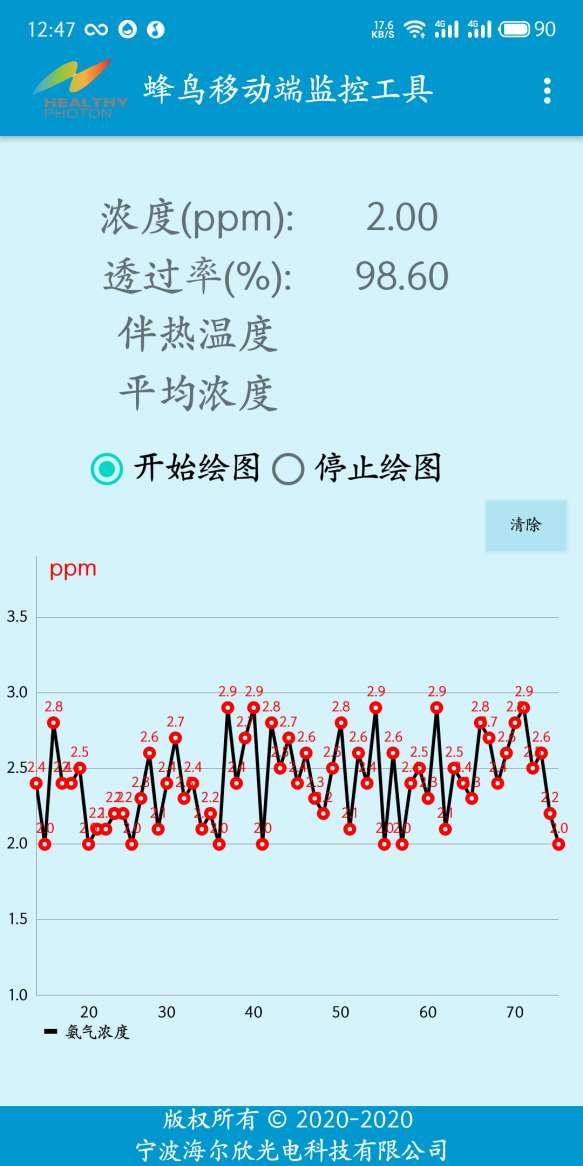 上图是依次通入氮气和20.8ppm氨标准气体的浓度测量曲线,根据HJ76-2017中的计算方法得到蜂鸟??榈牧愕闫?零漂)为1.01%,量程漂移为0.77%。