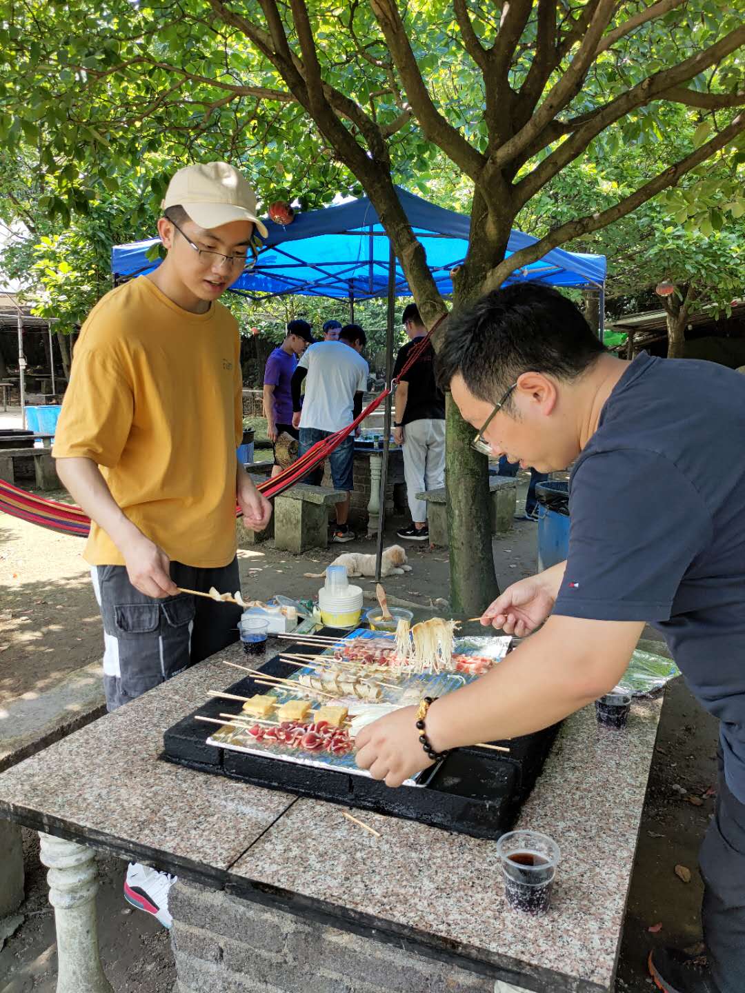 烧烤在树荫底下,小湖边,倒有些世外桃园的感觉。热心的老板娘早早的准备好了一切,大家各自有条不紊地忙碌了起来。几个小孩子尤其活泼,嚷着要爬山,一会又要玩吊床,一会又去玩跳棋,熟悉的很快,很快就互相打成一片。相比他们,大人们在这一刻更是享受这种出行的轻松感。几个人坐在火热的烤架前,火热的聊着天,丝毫不畏烤炉的火热?;褂心抢习逖哪贪咨男∧坦?,萌萌的、嘟嘟的,康鹏格外喜欢,对着他一顿抓拍。其中一只好像看上了这位大帅哥,追着他跑,大家忍俊不禁,没想到在公司人缘极好的康博士在犬界也有着极高的吸引力。