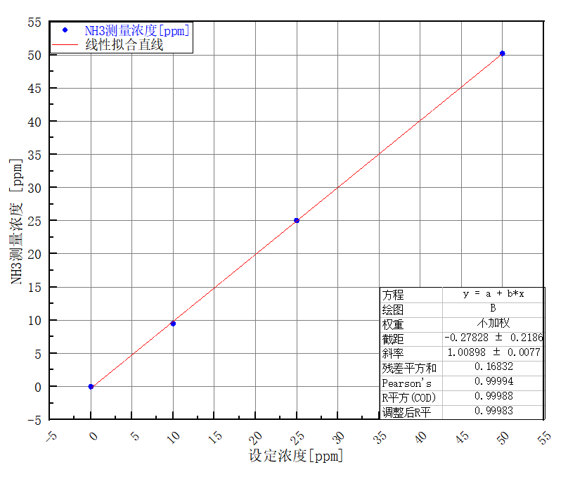 利用表1中数据,对设定浓度和测量浓度作线性拟合,可以得到线性系数为1.009,截距为-0.278,R2等于0.9998表明LGM1600-P具有极好的线性度。