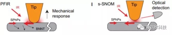 扫描探针显微镜与红外线照射的结合提供了在中红外波段突破衍射极限的方法。这些技术之一是红外散射型扫描近场光学显微镜(s-SNOM),它使用由原子力显微镜(AFM)定位的尖锐金属涂层探针来局部增强光场并激发或极化样品中声子。随后,由尖锐探针对由样品产生或衰减的高空间频率光学近场进行局部探测,因此提供了空间对比度优于传播光学场的衍射极限。
