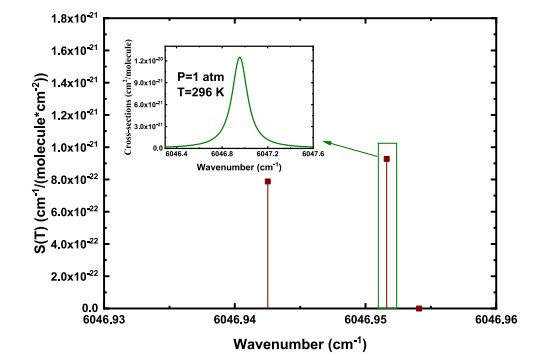 Fig. 2. The spectral line intensities of CH4 in the tuning range of 6046.93–6046.96 cm? 1 and the cross-section of the selected line obtained from the HITRAN database.