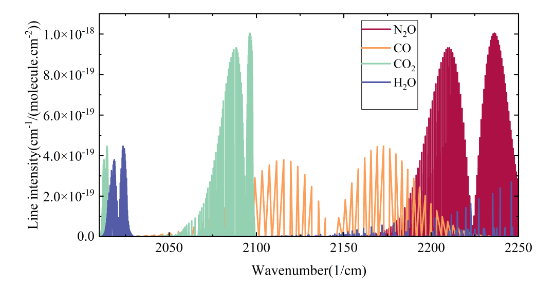 Figure 2. The intensity distribution of absorption lines of N2O, CO, CO2, and H2O in the range of 2000–2250 cm?1.