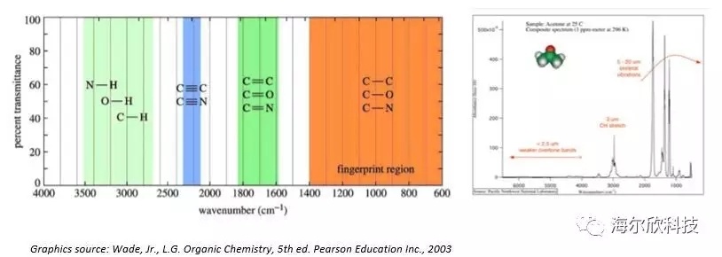 共价键的典型红外吸收位于600-4000cm-1。(在光谱学中,通常以厘米的倒数,即波数来表示跃迁频率。将该量乘以光速(c)得到频率,单位为赫兹;因此1 cm-1约为30 GHz)。