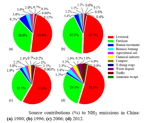 中国氨排放源比例:图(a)1980年;图(b)1996年;图(c)2006年;图(d)2012年,图片来源于[2]