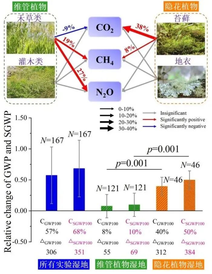 此外,本研究还量化了湿地N2O排放对增温的响应。虽然湿地N2O排放通量较低,但气候变暖显著增强(约27%)了禾草类植物占优势的湿地氧化亚氮的净排放??悸堑桨倌瓿叨壬螻2O的温室效应是CO2的298倍,即使少量的N2O排放增加也可能对全球升温产生不可忽视的贡献。本研究还发现,在维管植物占优势的多年冻土湿地,气候变暖会更加显著地促进CH4和N2O的净排放,从而对气候变暖产生正反馈作用。