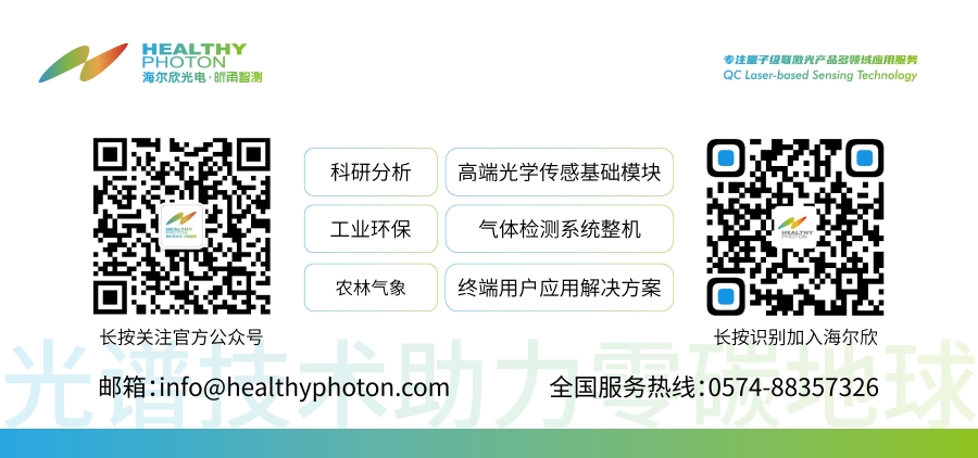 HT8800系列便携式高精度温室气体分析仪(二氧化碳/CO2、甲烷/CH4、氧化亚氮/N2O、水/H2O由宁波海尔欣光电科技有限公司(HealthyPhoton)自主研发、生产、销售。该系列仪器基于量子级联激光技术设计,利用气体分子在中远红外的“指纹”吸收谱,使用世界领先的半导体量子级联激光器(QCL)作为光源,使激光通过独创的中红外增强型光腔,被中红外光电探测器接收透射光并提取和分析透射光谱,准确反演获得目标温室气体成分的浓度,实现对目标温室气体分子的更精确、更及时、更科学的测量。