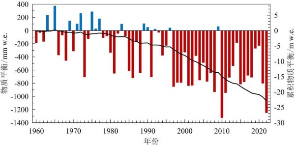物质平衡(柱形图)和累积物质平衡(曲线,相对于1960年)变化