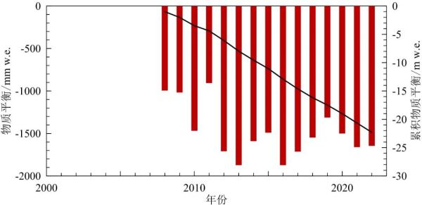 物质平衡(柱形图)和累积物质平衡(曲线,相对于2008年)变化