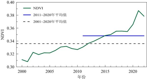 中国植被覆盖整体稳定增加,呈现持续变绿趋势。2000~2022年,中国年平均归一化植被指数(NDVI)呈显著的上升趋势,2022年中国平均NDVI为0.379,较2011~2020年平均值上升8.7%,是2000年以来的第二高值。