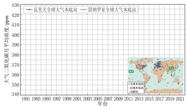 全球大气本底站大气二氧化碳月均浓度变化