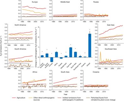 Abstract: Nitrous oxide (N2O), like carbon dioxide, is a long-lived greenhouse gas that accumulates in the atmosphere. Over the past 150 years, increasing atmospheric N2O concentrations have contributed to stratospheric ozone depletion and climate change, with the current rate of increase estimated at 2 per cent per decade. Existing national inventories do not provide a full picture of N2O emissions, owing to their omission of natural sources and limitations in methodology for attributing anthropogenic sources. Here we present a global N2O inventory that incorporates both natural and anthropogenic sources and accounts for the interaction between nitrogen additions and the biochemical processes that control N2O emissions. We use bottom-up (inventory, statistical extrapolation of flux measurements, process-based land and ocean modelling) and top-down (atmospheric inversion) approaches to provide a comprehensive quantification of global N2O sources and sinks resulting from 21 natural and human sectors between 1980 and 2016. Global N2O emissions were 17.0 (minimum–maximum estimates: 12.2–23.5) teragrams of nitrogen per year (bottom-up) and 16.9 (15.9–17.7) teragrams of nitrogen per year (top-down) between 2007 and 2016. Global human-induced emissions, which are dominated by nitrogen additions to croplands, increased by 30% over the past four decades to 7.3 (4.2–11.4) teragrams of nitrogen per year. This increase was mainly responsible for the growth in the atmospheric burden. Our findings point to growing N2O emissions in emerging economies—particularly Brazil, China and India. Analysis of process-based model estimates reveals an emerging N2O–climate feedback resulting from interactions between nitrogen additions and climate change. The recent growth in N2O emissions exceeds some of the highest projected emission scenarios, underscoring the urgency to mitigate N2O emissions.