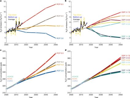 Fig. 4 Historical and projected global anthropogenic N2O emissions and concentrations. a–d, Global anthropogenic N2O emissions (a, b) and concentrations (c, d) compared to the four RCPs in the IPCC assessment report 5 (a, c; ref. 2) and the new marker scenarios based on the SSPs used in CMIP6 (b, d; ref. 48). The historical emissions data are represented as the mean of the bottom-up and top-down estimates of anthropogenic N2O emissions, whereas the historical atmospheric concentration data are from the three available observation networks: AGAGE, NOAA, and CSIRO. Top-down anthropogenic emissions were calculated by subtracting natural fluxes derived from bottom-up approaches. To aid the comparison, the four RCPs were shifted down so that the 2005 value is equal to the 2000–2009 average of the mean of top-down and bottom-up estimates. The SSPs are harmonized3 to match the historical emissions used in CMIP649; Extended Data Fig. 10 shows the unharmonized data.