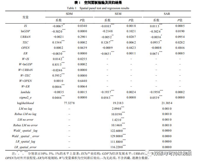 1)空间面板模型分析。在进行空间模型选择之前,首先要构建LM检验统计量进行空间相关性检验,结果如表1所示,可以看出LMnolag、LMnoerror、RobustLMnolag、RobustLMnoerror均在1%的显著性水平下拒绝了不存在空间依赖性的原假设,与上文莫兰指数的结果一致,表明需要构建空间计量模型进行分析。进一步,构建Wald与LR统计量来检验空间杜宾模型是否可以简化成空间滞后模型或空间误差模型,从下表可以看出,两个统计量均在1%的显著性水平下拒绝了原假设,SDM模型不能简化为SEM模型或SAR模型。因此,本文采用时空双固定空间杜宾模型进行分析。