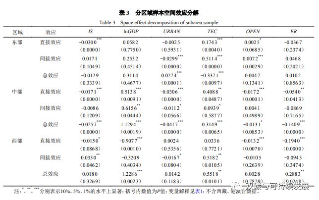 从地区层面来看,①产业结构:东部地区与中部地区间接效应不显著,直接效应为负值,表明东部与中部地区第二产业比重的提升会抑制该地区?。ㄊ校┨寂欧殴叫缘奶嵘?;西部地区的直接效应与间接效应分别在10%与5%显著性水平下为负值与正值,表明西部地区第二产业比重的提升对本省碳排放公平性有负向影响,但第二产业增加带来的高污染也会促使人口与第三产业向周边省(区、市)转移,从而对其碳排放公平性产生正向空间溢出效应(表3)。②经济发展水平:东部地区的直接效应与间接效应不显著;中部地区的直接效应与间接效应分别在1%与5%的显著性水平下为正值,可能是由于东部地区经济发展水平最高,经济发展带来的碳排放效率提升与其造成的环境污染正负作用相抵消,而中部地区由于经济发展水平低于东部地区,经济发展对碳排放效率提升作用大于其带来的环境污染;西部地区经济发展水平最低,大部分?。ㄇ?、市)更加迫切提升自身的经济实力,对环境?;さ墓刈⒔仙?,因此,经济发展水平的提升会对本省(区、市)碳排放公平性带来负向抑制作用。③城镇化进程:东部地区与西部地区的直接效应不显著,间接效应分别在1%与10%的水平下显著为负,这是由于城镇化进程实施过程中必然会带来产业发展、基础设施建设、环境污染等问题,如果无法妥善解决就会对周边?。ㄇ⑹校┨寂欧殴叫源锤合蚩占湟绯鲂в?;中部地区的城镇化进程不仅抑制了周边?。ㄇ?、市)碳排放公平性,对自身碳排放公平性也产生了显著抑制作用。④技术创新:东部地区技术创新的直接效应与间接效应均在1%的水平下显著为正,这是由于东部地区技术存量较高,技术创新带来的挤出效应不仅促进本省碳排放公平性水平,还存在显著空间溢出效应;中部地区技术创新的直接效应与间接效应分别在5%与10%的显著性水平下为正;西部地区技术创新的直接效应不明显,间接效应在5%的显著性水平下为正值,其原因在于西部地区的技术存量较低,技术创新对于碳排放公平性的促进作用尚未明显发挥,但仍然存在一定的空间溢出作用。⑤对外开放水平:东部地区的外商投资直接效应与间接效应分别在10%与1%水平下显著为正,原因在于东部地区本身经济发展水平较高,对外商投资的准入机制比较严格,因此,外商投资不仅会对本省的碳排放公平性有正向作用,也会降低相邻省(区、市)外商引入成本从而促进其碳排放公平性提升;中西部地区间接效应不明显,直接效应在1%水平下显著为负值,主要在于中西部地区外商投资引入较少且环境准入机制相对宽松,因而对本?。ㄇ?、市)碳排放公平性产生抑制作用。⑥环境规制:东部地区直接效应与间接效应不显著,主要原因在于东部地区环境规制较严格,环境规制对碳排放的抑制作用与中小企业扩大生产规模带来的碳排放相抵消,因而效应不明显;中西部地区间接效应不明显,直接效应分别在5%和10%水平下显著为负值,原因在于中西部地区环境规制相对宽松,环境规制对碳排放的抑制作用小于中小企业扩大生产规模带来的碳排放,因而对本省碳排放公平性产生负面影响。