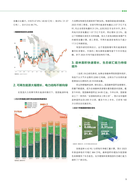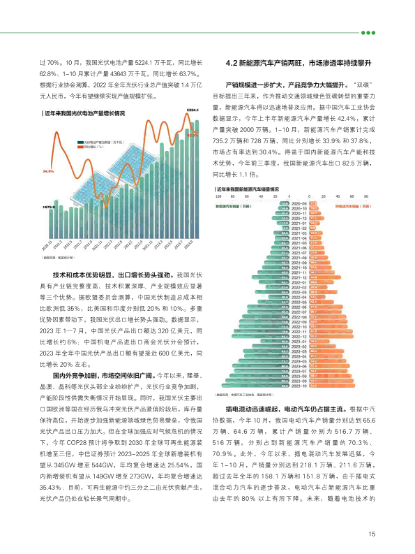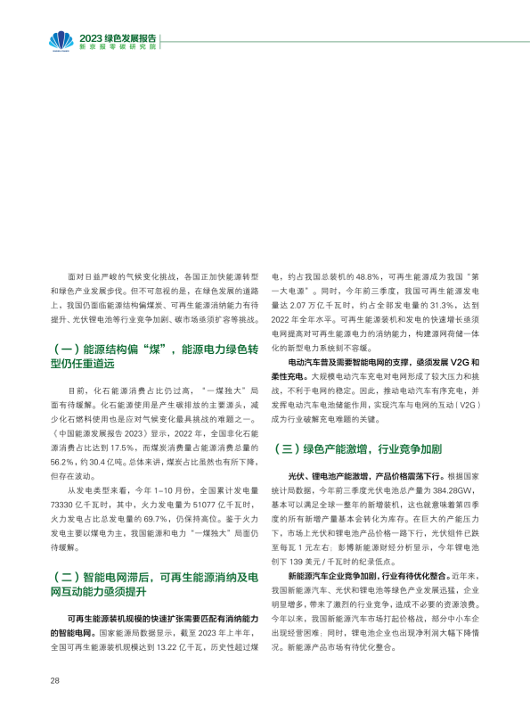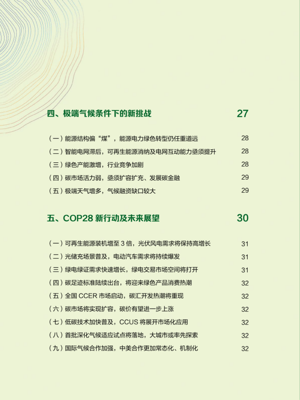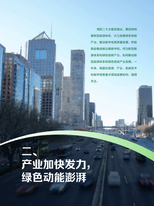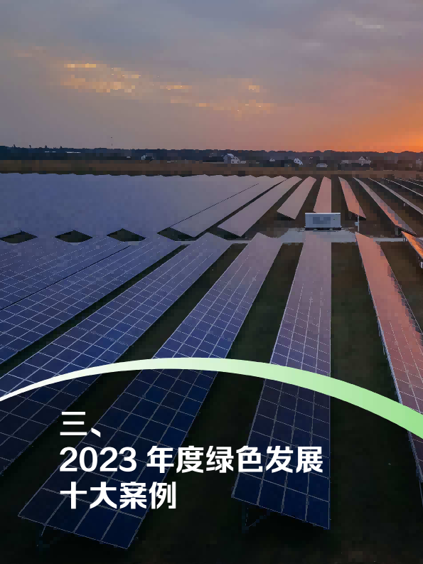 报告回顾了2023年绿色发展的趋势,从双控转变推动绿色发展、产业助力绿色动能、2023年度绿色发展十大案例等角度阐述了绿色发展带来的产业变革与低碳成效。报告又通过对极端气候条件下的新挑战、COP28新行动等议题作深入研究,提出未来绿色发展的趋势与展望??稍偕茉醋盎看蠢沸赂?,并超越煤电成为我国"第一大电源";新能源汽车光伏和理电池成为出口新三样,成为拉动经济增长的绿色新动能。