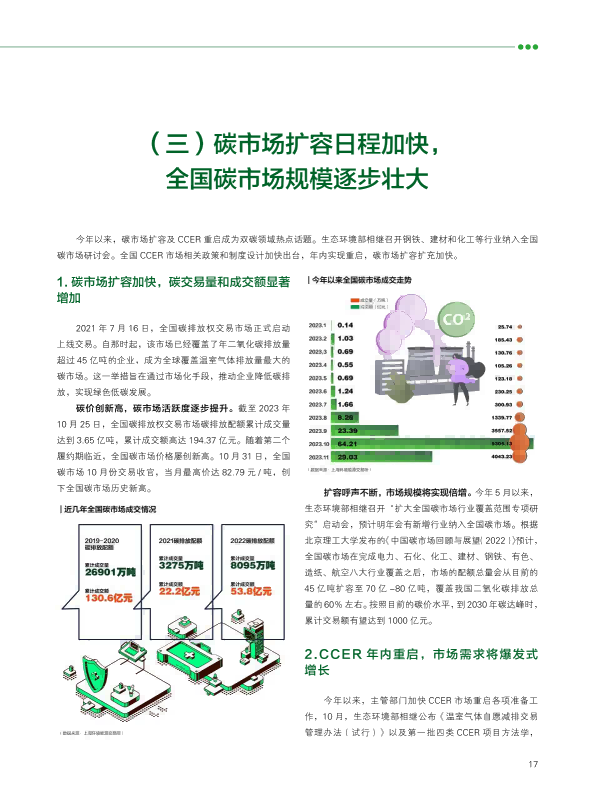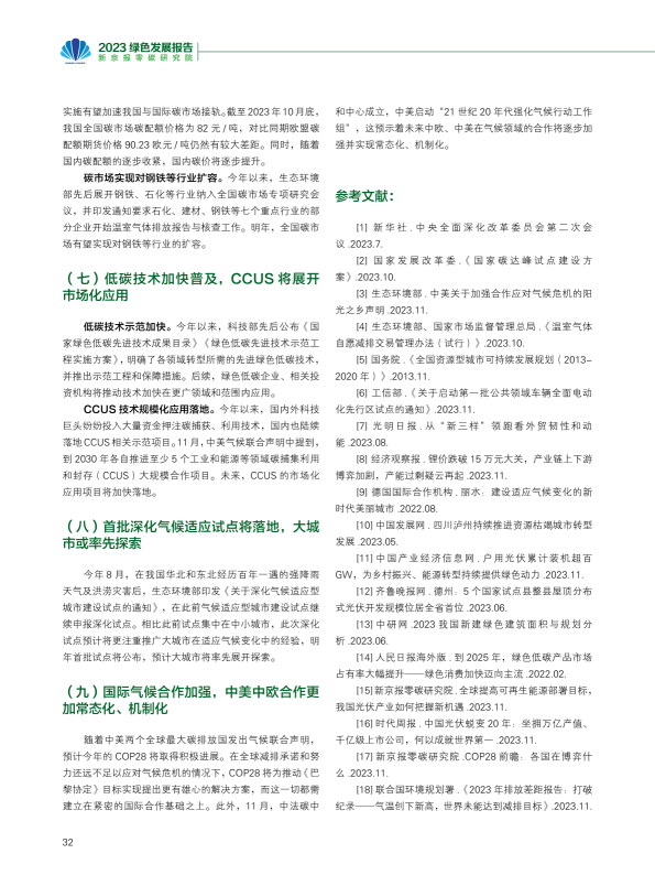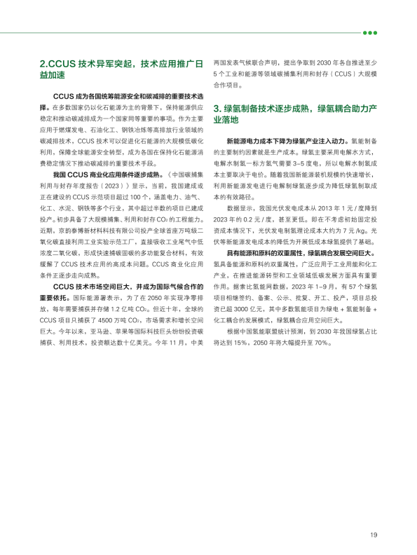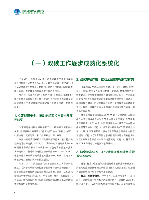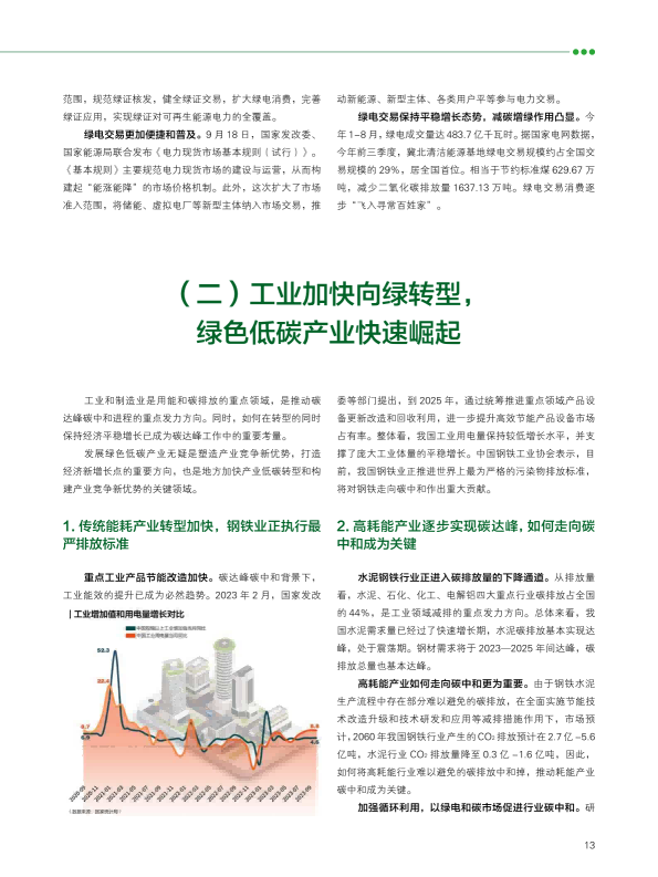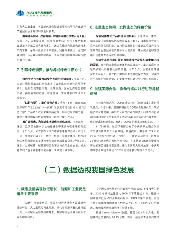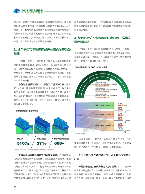 报告回顾了2023年绿色发展的趋势,从双控转变推动绿色发展、产业助力绿色动能、2023年度绿色发展十大案例等角度阐述了绿色发展带来的产业变革与低碳成效。报告又通过对极端气候条件下的新挑战、COP28新行动等议题作深入研究,提出未来绿色发展的趋势与展望??稍偕茉醋盎看蠢沸赂?,并超越煤电成为我国"第一大电源";新能源汽车光伏和理电池成为出口新三样,成为拉动经济增长的绿色新动能。