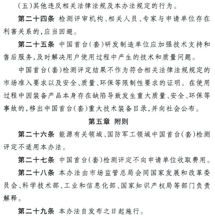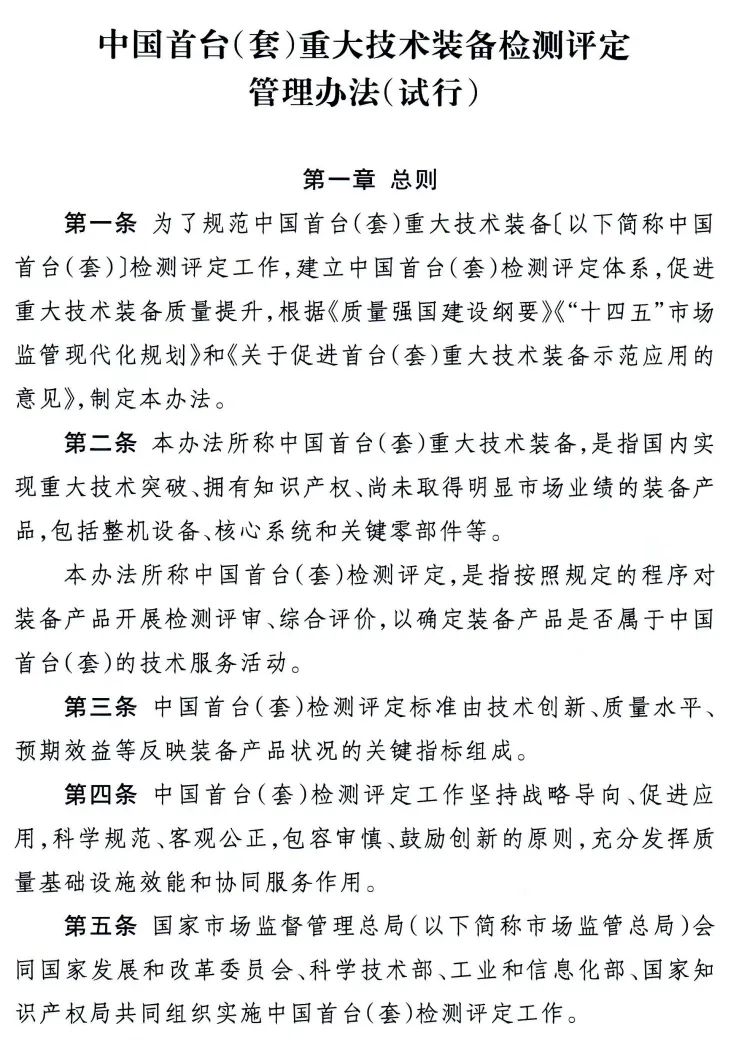 为促进我国重大技术装备质量提升,支撑重大技术装备攻关工程,推动制造业高端化、智能化、绿色化发展,加快推进新型工业化,市场监管总局、国家发展改革委、科技部、工业和信息化部、国家知识产权局5部门近日联合印发《中国首台(套)重大技术装备检测评定管理办法(试行)》(以下简称《办法》)。