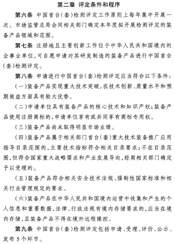 重大技术装备是国之重器,事关综合国力和国家安全。《办法》明确,中国首台(套)重大技术装备〔以下简称中国首台(套)〕是指国内实现重大技术突破、拥有知识产权、尚未取得明显市场业绩的装备产品,包括整机设备、核心系统和关键零部件等。中国首台(套)检测评定是指按照规定的程序对装备产品开展检测评审、综合评价,以确定装备产品是否属于中国首台(套)的技术服务活动。