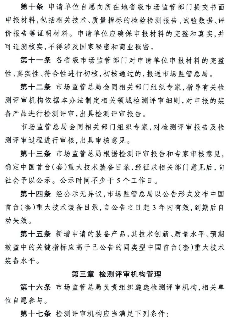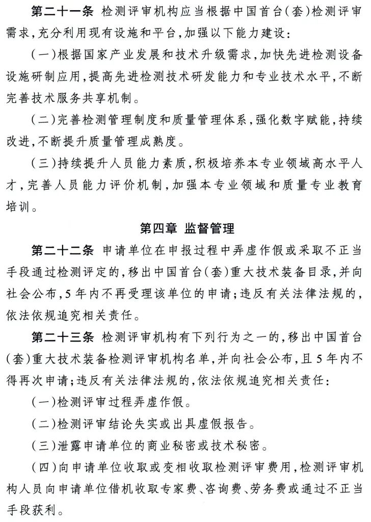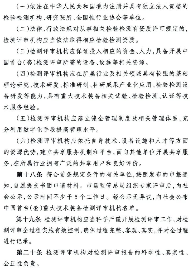此外,《办法》详细规定了中国首台(套)检测评审机构的遴选程序和工作要求。同时,为了提升检测评审机构能力,从提高技术水平、加强质量管理和优化人员配置方面对检测评审机构提出具体要求。