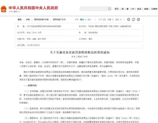近日,财政部发布《关于实施设备更新贷款财政贴息政策的通知》(财金〔2024〕54号),为设备更新贷款提供财政贴息支持,进一步推动设备更新和消费品以旧换新。此政策明确了支持范围、贴息标准、期限条件等关键内容,对符合条件的经营主体提供贷款贴息,有效减轻了企业的财务负担,加速了设备更新的进程。
