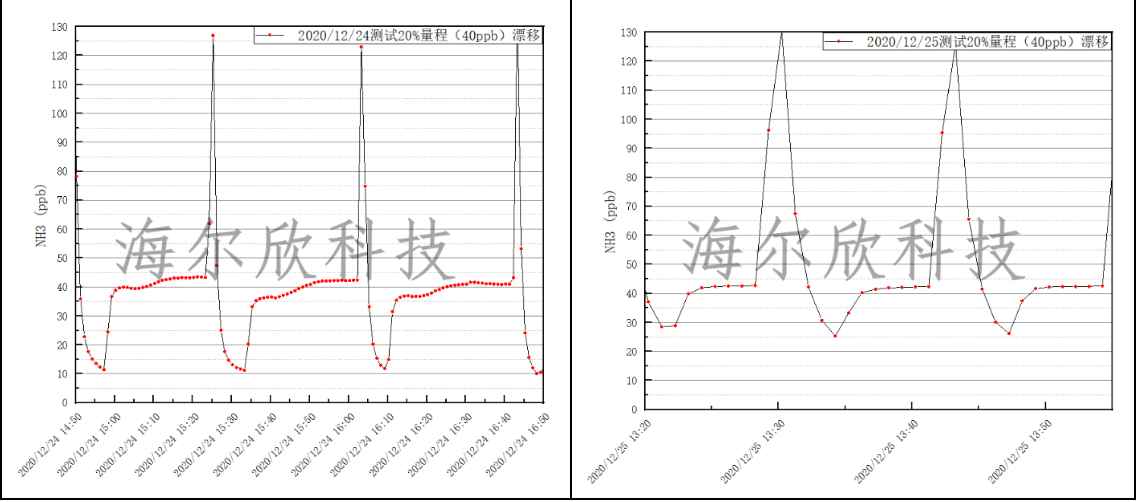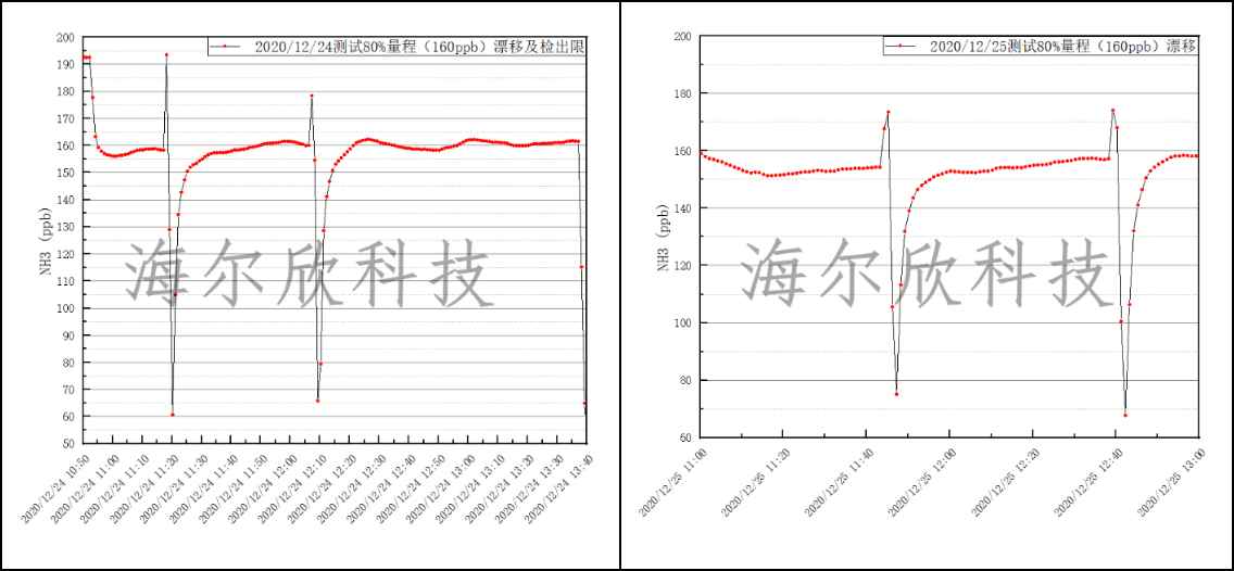 漂移:按 HJ654-2013 的测试要求计算 24h的零点漂移、20%量程漂移和80%量程漂移。测试如下图。
